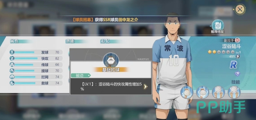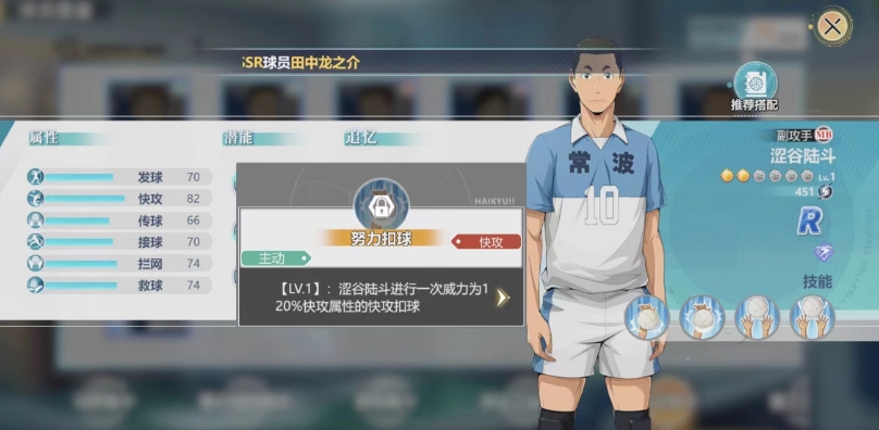 在r级的副攻手中,小编必须要为大家介绍的就是叫做涩谷陆斗的这个角色,他在游戏中不仅好获取,在技能上面也更容易理解,第一个技能是基础扣球,大家可以从他的基础扣球技能了解他的整体效果,这个被动技能使得涩谷陆斗在进行快攻时,整体的快攻属性得到5%的提升。
