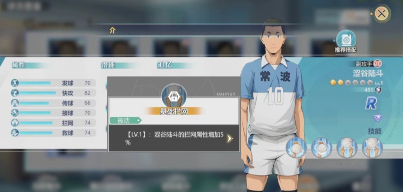 当激活时涩谷陆斗能够执行一次威力高达120%快攻属性的特殊扣球,这种攻击方式不仅速度快,而且威力巨大,常常让对手防不胜防,在实际比赛中,合理利用这一技能可以迅速积累分数优势,或是在落后时迅速追分,转向防守端的时候,大家可以看到涩谷陆斗的基础拦网技能。
