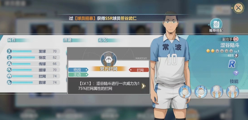 这项被动技能同样提升了他5%的拦网属性,使他在对抗对方进攻时更为安全,这5%的提升在数据上可能看起来比较少,但在高水平的对决中,制胜的关键就是这些微小的数值,最后就是是涩谷陆斗的努力拦网技能,作为一项主动技能,它允许涩谷陆斗进行一次高达175%拦网属性的特殊拦网。