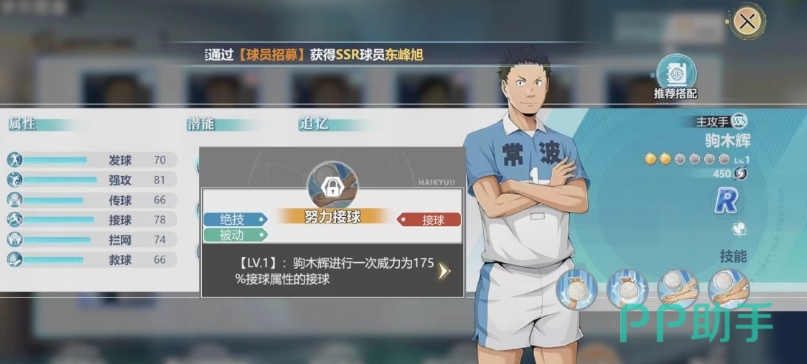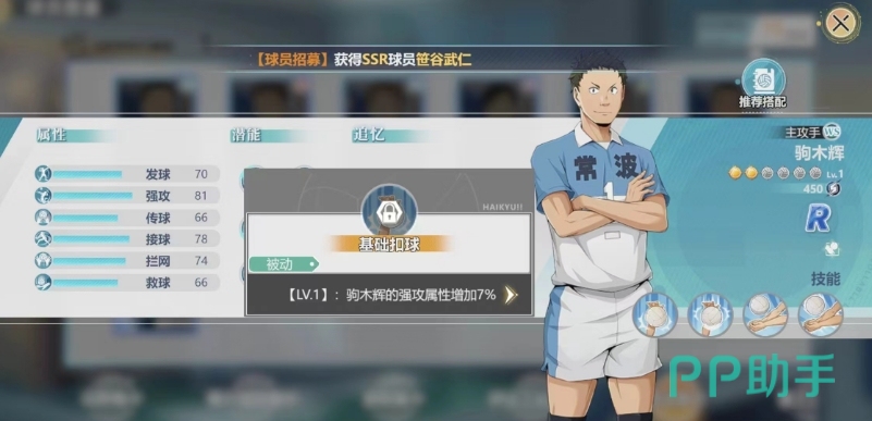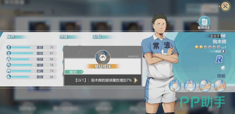 能够给对方造成巨大的压力,大家可以在在驹木辉的强攻属性达到最高时使用这一技能,以确保每次使用都能达到最佳效果,适合在比赛的决胜点使用,第三个被动技能是基础接球,这个效果触发驹木辉的接球属性增加7%,这一技能使他在接球方面更加稳定,能够有效地化解对方的攻势,在对方的发球局,大家可以尽量让驹木辉参与接球,充分利用他的接球能力。