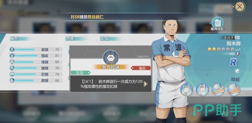 在比赛中大家可以积极寻找机会让驹木辉进行强攻,尤其是当对方防守出现空档时,他的强攻不仅能够直接得分,还能为队友创造更多的进攻机会,第二个主动技能是努力扣球,驹木辉进行一次威力为120%强攻属性的强攻扣球,这个技能是他的招牌技能。