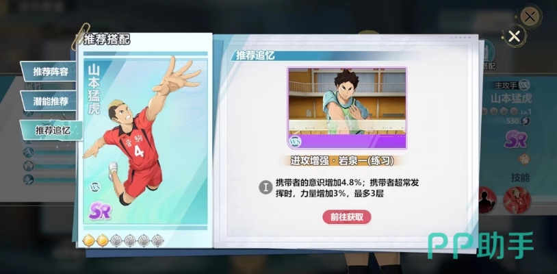 阵容上面可以跟灰羽列夫一起搭配使用,也可以跟爪研磨加上灰羽列夫一起用,可以搭配的角色还是挺多的,套装上面气势强攻跟强攻振奋都可以,毕竟他的潜能就在强攻跟接球的效果上面,追忆就选择进攻增强,这个追忆直接增加了携带球员的意识提升4.8%,这对于排球比赛中的精准扣球和战术布置至关重要。