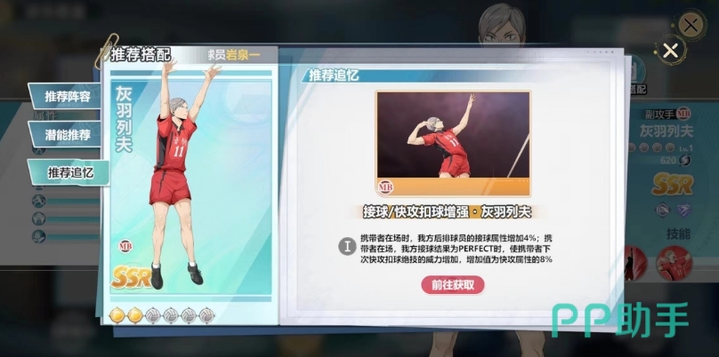 追忆选择上面大家可以选择带来接球、快攻扣球增强,灰羽列夫的这个强追忆技能体现了他作为副攻手的全面性和战术价值,当他在场时,我方后排球员的接球属性增加4%,高了球队的接球稳定性,减少了对手进攻的成功几率。