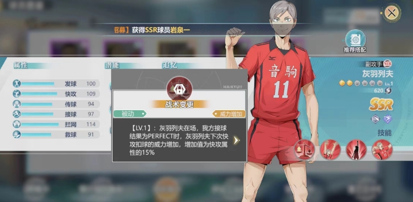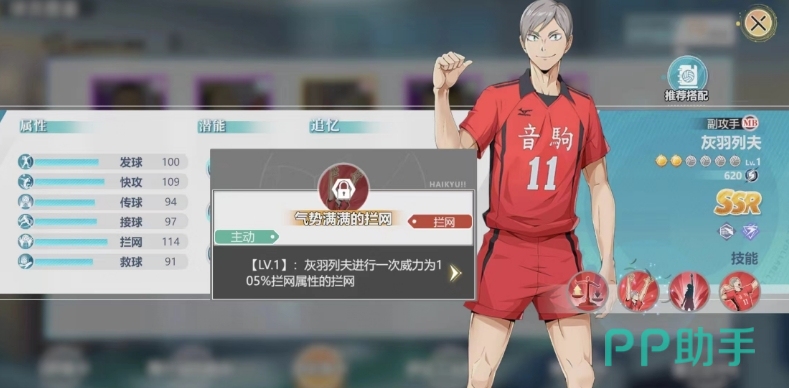 后期他的性格开朗自信,对排球充满热爱,这些品质在与队友夜久的合作中逐渐显现,并帮助他克服了比赛中的不足,所以后期的配队上面大家可以这样考虑,在技能方面,灰羽列夫拥有扣球的天分,这是一种强大的主动技能,能够执行一次接近250%快攻属性的扣球。