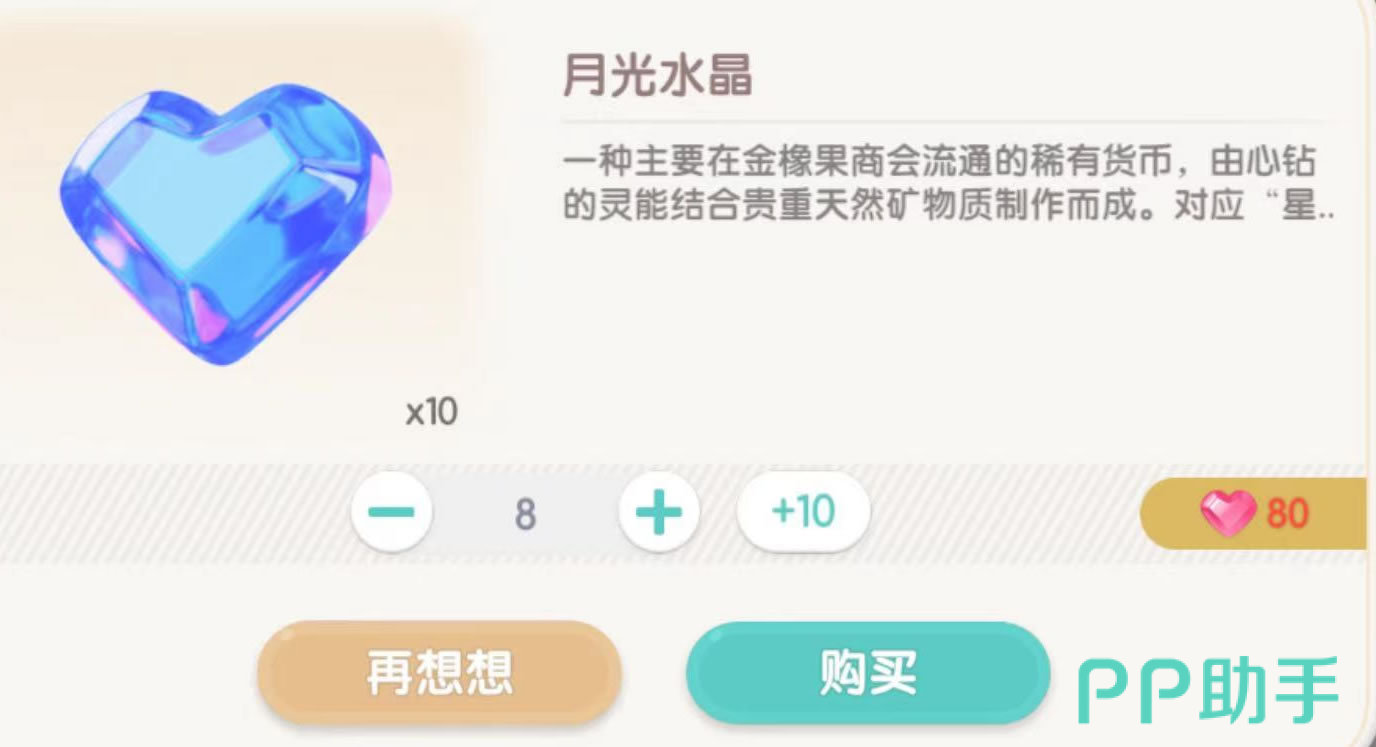 月光水晶虽然名为“月光”,其实和月卡也没有相关。这是一种比较稀有的货币,主要用于购买金橡果商会中的特殊材料或比较珍贵的服装、家具等。如果急需月光水晶用来添置靓丽的时装和豪华家具,那么使用心钻可以直接兑换月光水晶。