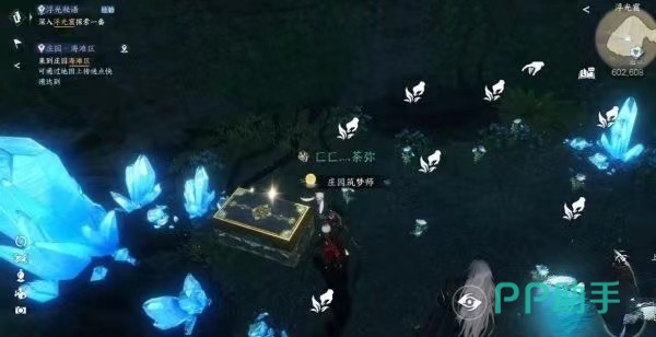 3、最终在浮光窟(坐标602,608)处找到宝箱,并开启宝箱以完成任务。宝箱内包含大量流光花等奖励,采摘流光花会消耗玩家的活力值。