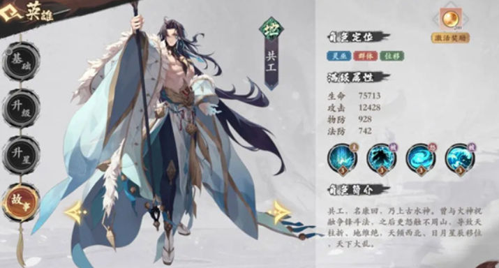 还有一个比较知名的角色就是共工,这是地阵营里的一个角色,虽然角色也是一个法师,但是注重的是群体和位移,在游戏里可以使用主动技能疾浪奔流对周围的所有成员带来80%的法术伤害,对战的时候需要选择出不同的角色组建阵营,阵营之间成员的互相搭配才能产生出较强的战斗能力,也正是因为法师角色的独特性,所以玩家能灵活的和其他的成员进行搭配。