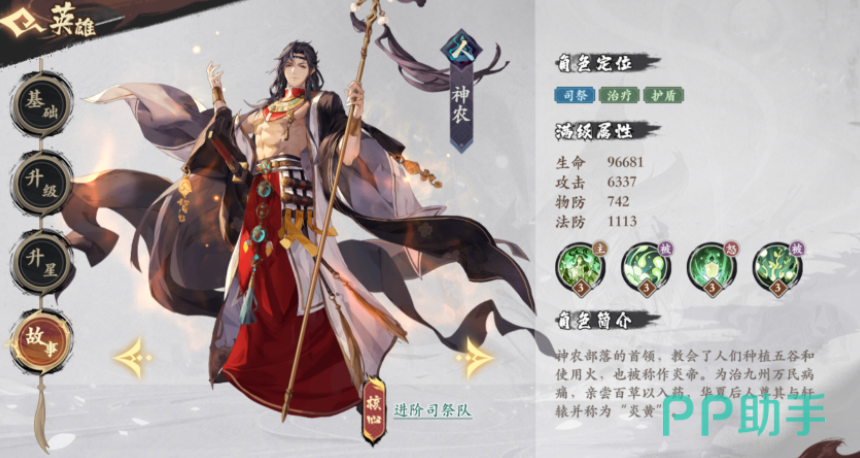 游戏里分成多个不同的阵营,人类阵营里有神农,这是一个比较偏向于治疗和护盾类的角色,对自然生命值也很高,对战过程中可以帮助队伍其他成员抵抗对方的伤害,就比如在游戏里角色的一技能是可以给自己增加护盾,并且提高全体对方成员防御能力。