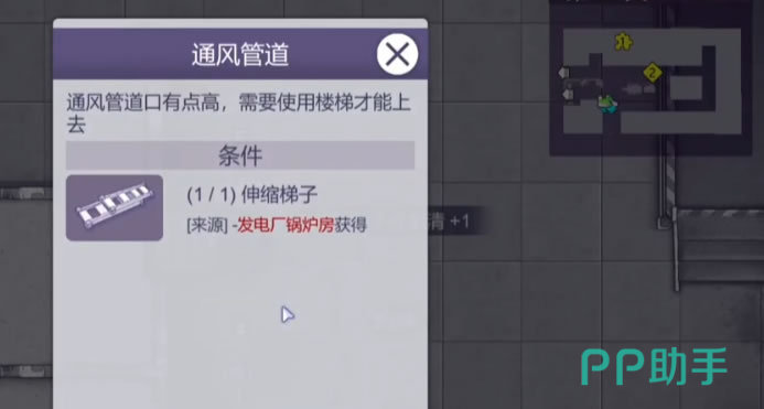 通风管道的口有点高,这里要使用伸缩梯子,梯子在发电厂锅炉房中可以拿到。上去之后的位置在左侧右下角,首先直行,遇到十字道口向右转,再到丁字道口往左转,接着继续往左,就可以从管道口下去了。
