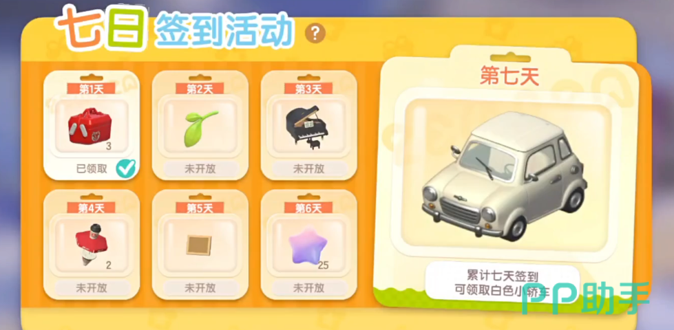 大家在游戏页面中找到右上角的地图图标点进去之后便可以看到活动页面,首先有一次七日签到活动,这里签到三天可以领取一架钢琴,七天还可以领取一辆白色的小轿车,让我们在游戏中移动时可以更加方便且拉风。