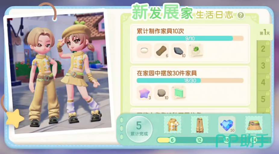 其次是新发展家生活日志的活动任务,这里每一天都有不同的任务可以完成,完成相应的任务便可以获得不同的奖励,任务完成的越多奖励就会越丰厚哦。大家如果完成任务数量累计到了指定的数量的话,还可以领取新套装和家具等等各种材料。