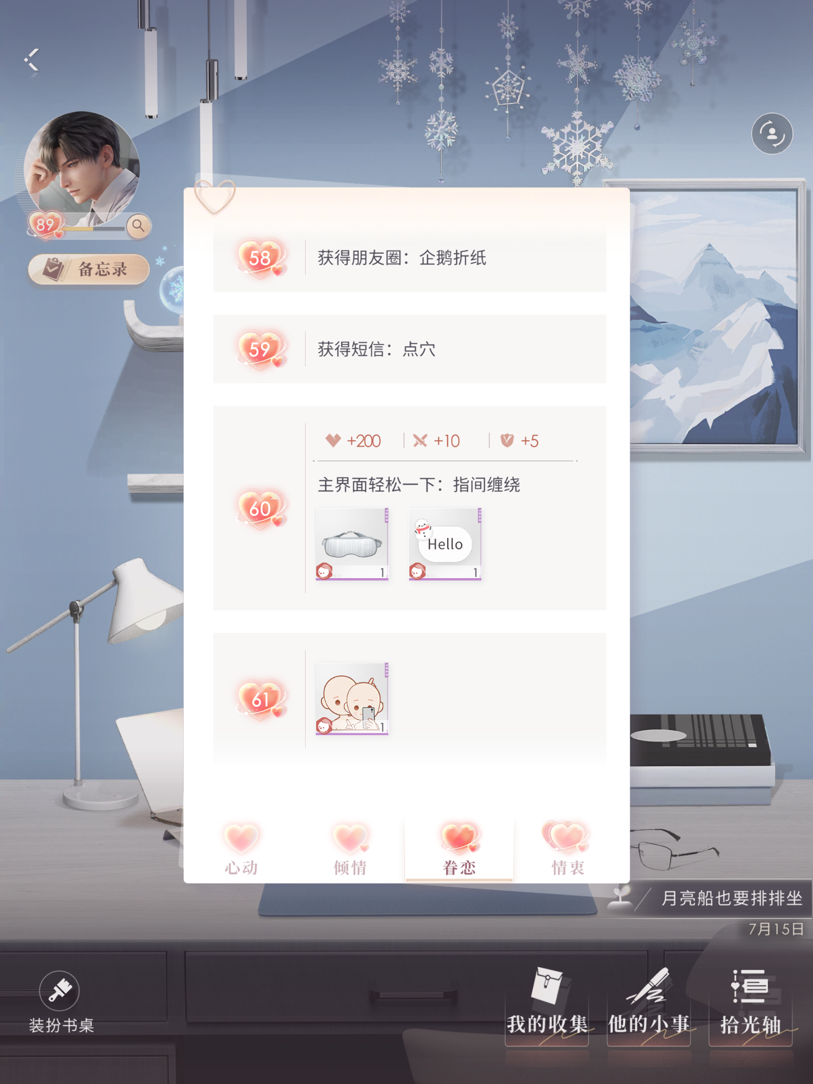 拿游戏当中的男主【黎深】为例子,如果大家将黎深的好感度提升到60级,那么大家使用黎深的卡面来战斗的时候,会额外获得200生命值,10点攻击力和5点防御力。同时,会解锁一个藏品【冰袋眼罩】,和男主短信的聊天气泡【萌萌雪人】。