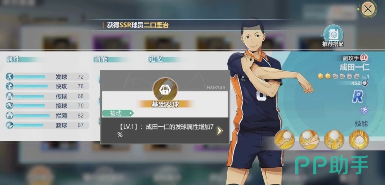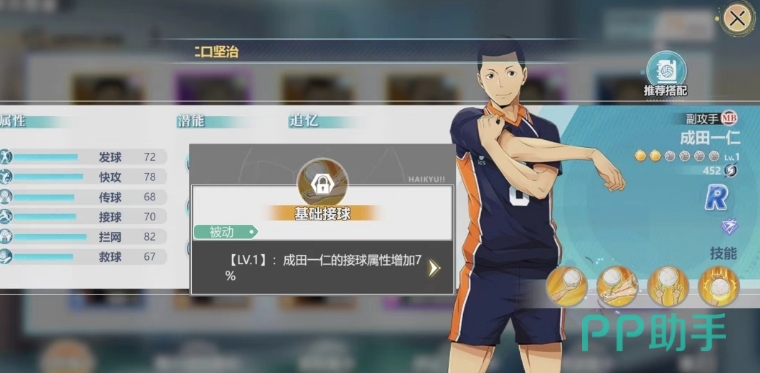 第二个被动技能基础接球,同样在提升后可以增加接球属性至9%,这个技能使成田在接对方攻击时比较稳定,如果是在竞技场和联赛中,稳定的接球还是比较关键的,至少对面发球的时候己方没有失分的情况。