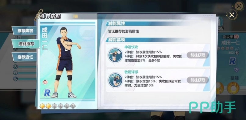 在潜能套装的选择上,由于没有具体的推荐属性,玩家可以根据需求灵活搭配。神速快攻打法是一个不错的选择,两件套增加15%的快攻属性,四件套则在释放快攻扣球技能时增加5%,最多叠加五层,这个潜能套装的效果增强了成田的扣球数值,而且后期潜能也是可以升级的。