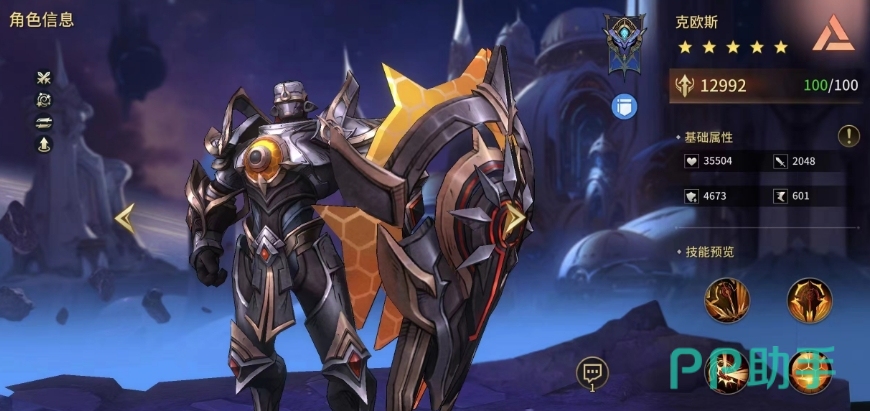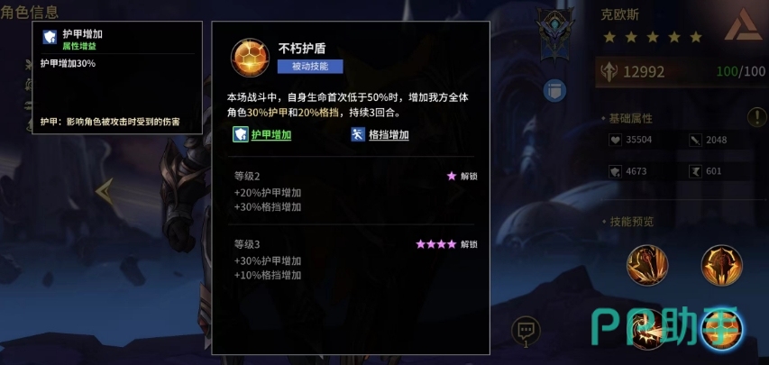 最后不朽护盾作为克欧斯的终极技能,当克欧斯的生命值首次低于50%时会触发,出发后为全队提供额外的护甲和格挡几率,持续三回合有效,这一技能的存在,让克欧斯在关键时刻能够帮助保护队伍内的重要输出角色,为团队带来一线生机,后期技能满级时可为全体队员提供高达90%的护甲增加和40%的格挡几率。