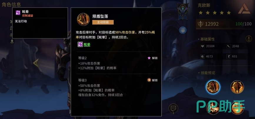 克欧斯作为一个潜力值很高的角色,实际大家使用他的时候可以通过掌握技能来搭配阵容,他的技能组合更适合成为战场上的盾牌角色,首先玩家应优先升级克欧斯的第一个主动技能陨盾坠落,它不仅能对后排敌人造成高达98%的攻击伤害,还有机会使目标眩晕两回合。