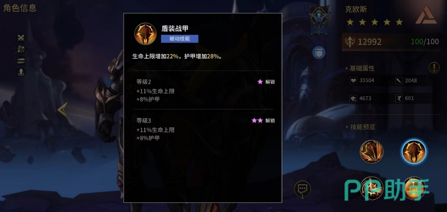 其次盾装战甲被动技能是克欧斯防御体系的核心,通过提高生命上限和护甲值,他就成为了游戏中最难以被击倒的坦克,技能达到三级时,可累计提供额外的22%生命上限和36%护甲数值,让克欧斯在战斗中如同一座坚不可摧的堡垒,这一增益不仅提高了克欧斯自身的坦度,也为队友创造了一个好用的防御,后期配合更多输出的机会就可以带来更高的强度输出。