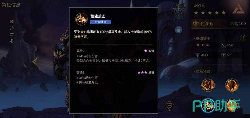 第三个技能蓄能反击作为另一项被动技能,让克欧斯在遭受会心伤害时能够进行反击,造成高达132%的伤害,并降低攻击者的精准度,有效控制住敌方的输出能力,随着技能等级的提升,反击伤害增至156%,同时精准度降低效果增至30%,持续两回合的效果,会极大增加了克欧斯的反制能力,使其在承受伤害的同时也能给予敌人沉重打击。