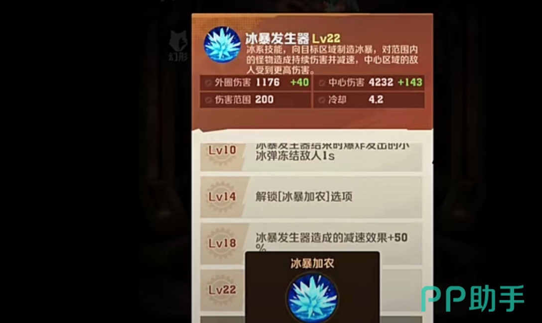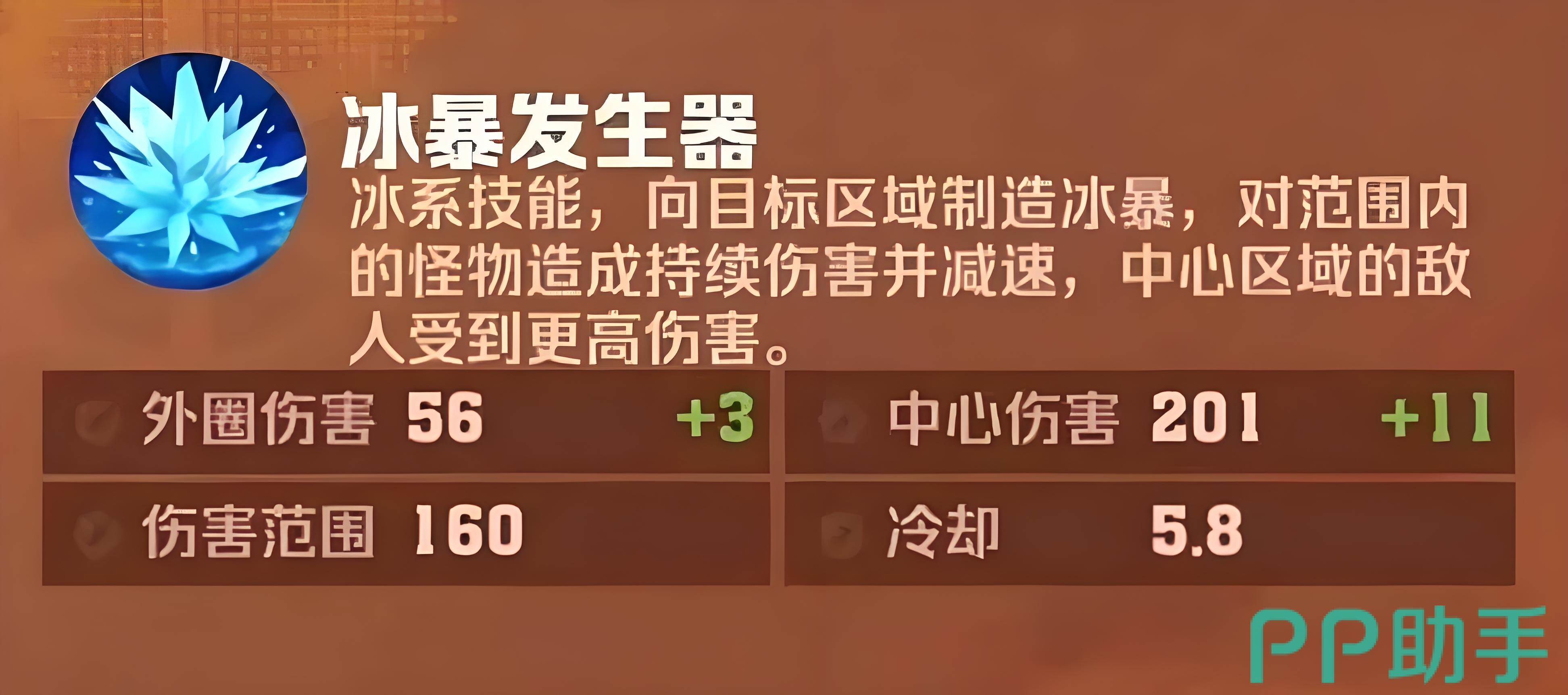 冰暴发生器是一种属于冰系的技能,玩家在把攻击目标锁定以后释放这个技能可以造成大范围的冰暴,敌人被击中后不仅会被该技能持续伤害,同时该技能还会给敌人附带减速的效果,在攻击目标区域中心位置的敌人所受到的伤害要要比其他位置受到的伤害更高。