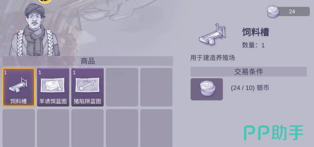 饲料槽作为建设养殖场必备的物品,可以在老吴那里购买到。价格也不高,只要10个银币;但是建议你同时再买上羊诱饵蓝图和猪陷阱蓝图,因为养殖场所需要的种羊和种猪,都需要到森林中去自己抓。另外一开始的养殖场只能养很少的数量,需要消耗各种材料对养殖场进行扩建。