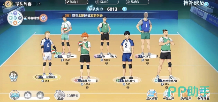 1号位为发球位,轮转至1号位的球员将负责开场发球,将发球实力强劲的球员轮转至1号位开场,可以在比赛开始时取得优势,或者是利用角色之间的技能来确认上阵角色,拥有上阵羁绊的球员组合中的全部球员都出场时激活,可使用该组合的羁绊技能或激活该组合的羁绊加成,我方场上同时有同一学校4名及以上球员时激活,可为场上所有球员提升属性,阵容特性包括:强攻、快攻、拦网、接球,共4种,快攻跟拦网需要放前面。