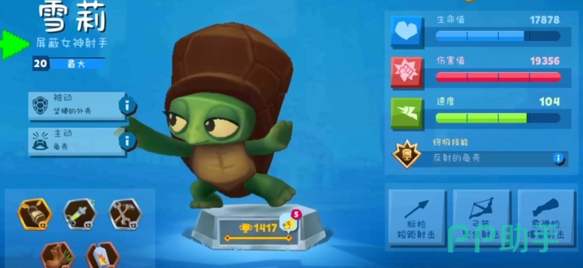 雪莉是一只绿色乌龟,是小编比较推荐的一个角色,即使不看技能,单看面板就能看出它的生命值很高,而且它在拥有高生命值的同时,伤害和速度也不低,雪莉的被动技能能直接减少自己受到的伤害,主动技能可以无敌四秒钟,终结技则能缩进龟壳反弹别人的发射物,这三个技能再加上自身的超高生命值使得雪莉能够抗很久的伤害。