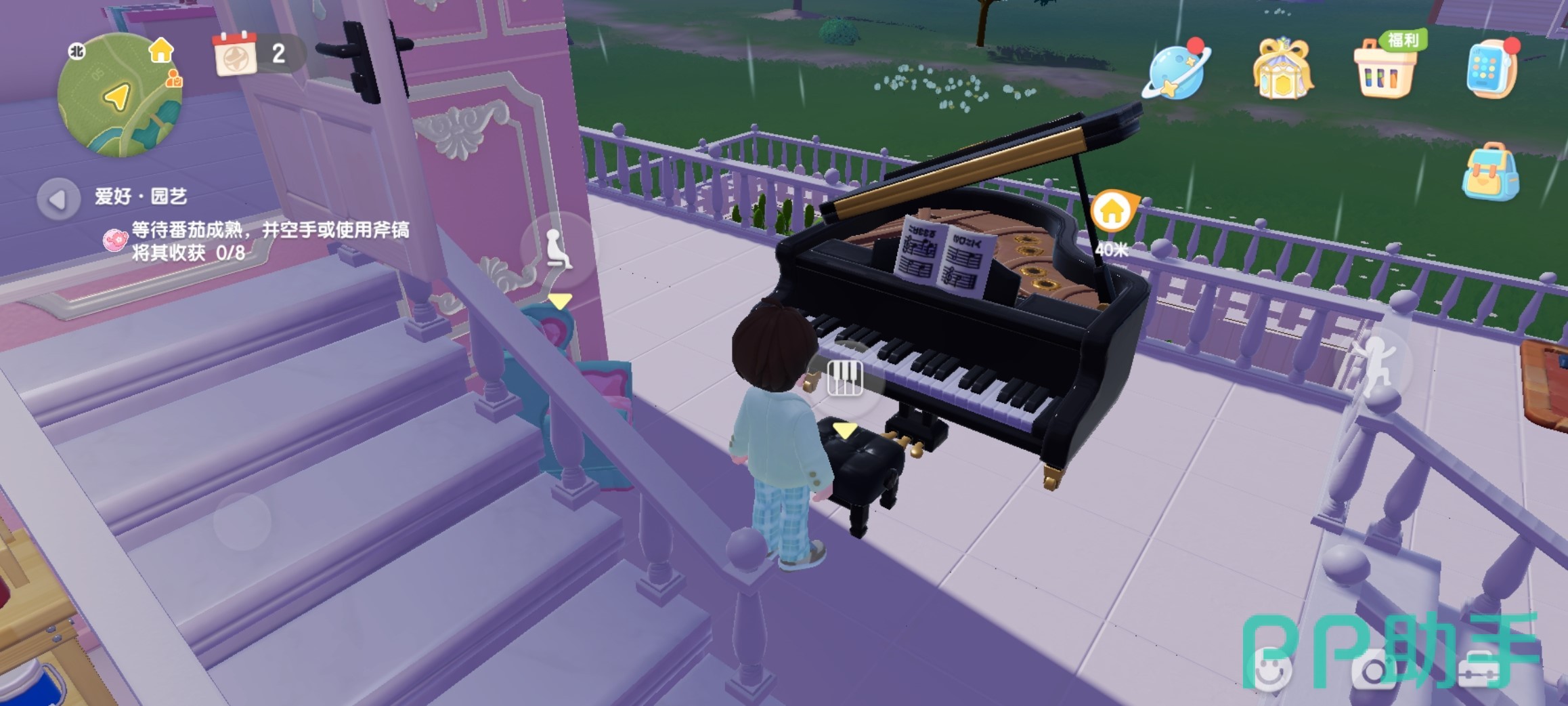 在游戏中有着一套简单易上手的钢琴玩法,你可以在城堡的二楼阳台上找到钢琴,或者使用自己的资源使用游戏中的工作台造一架自己的钢琴。靠近钢琴时会出现一个小小的钢琴按钮,点击按钮便可以使用钢琴了,这时还有一套精致的坐上钢琴的动画。