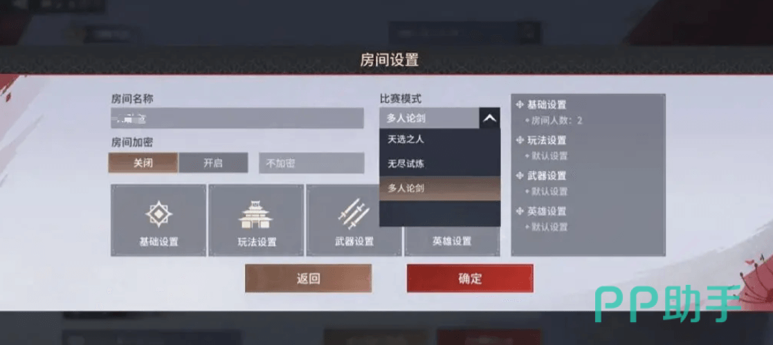 调整到2人这一步十分关键,将决定玩家能不能进行1v1对战,除了这些主要设置外,玩家还能设置其他参数比方说比赛的时长和胜利的条件,将想要的设定完成后,点击确认,1v1房间就创建完成了。