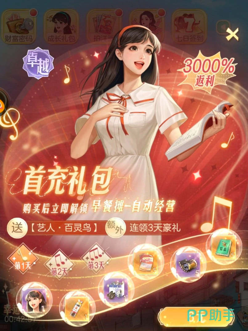 最后就是首充礼包,礼包只需要6元就能解锁,可以直接获得一个紫色品质的艺人以及部分的道具资源,可以提升玩家前期的游戏体验!