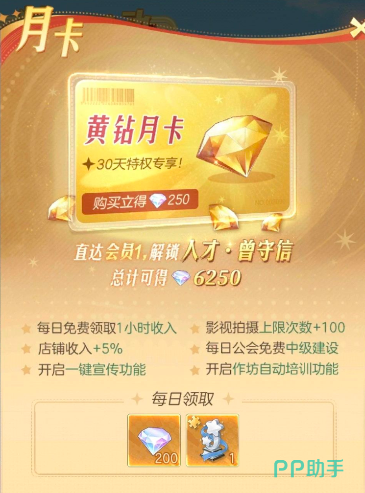 如果有能力的话可以购买年卡,年卡也是每天获得钻石奖励,但是会赠送十次的免费旅游功能以及高级摄影功能,可以让玩家的店铺变得更加好看,就是收益不是特别高。