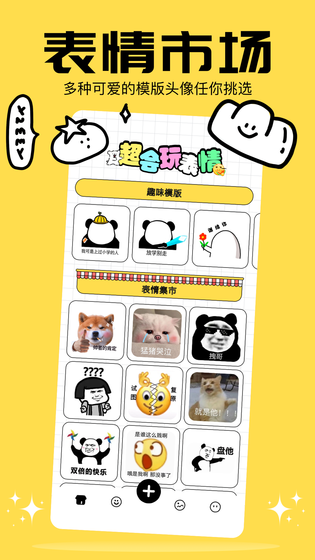 这款APP能够让人轻松的发挥创意,创作个人专属表情包,可以通过拍照拍摄的方式留存下经典的影像。并通过APP上的模板市场像各种可爱的模板头像清晰的套入到自己的拍摄的照片里面去,还有一些表情市场的精品表情可以直接获取。