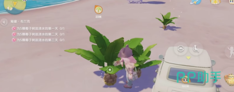 这一天的筹建任务就比较多,先是布兰克的浇水任务,坐公交去任务点给地上的五颗椰子树浇水,当然也可以给1颗椰子树浇水5次,同样可以满足任务条件。然后是弗妮的告示牌任务,在告示牌上写上标语,都在沙滩附近,一共有3块。