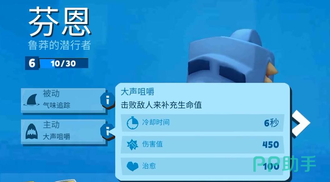 芬恩的主动技能是大声咀嚼,使用收会冲向对手并造成伤害,同时还会窃取一些目标的生命自己使用,被动是气味追踪能知道低生命值对手的位置,哪怕对手躲藏起来也会被看到。