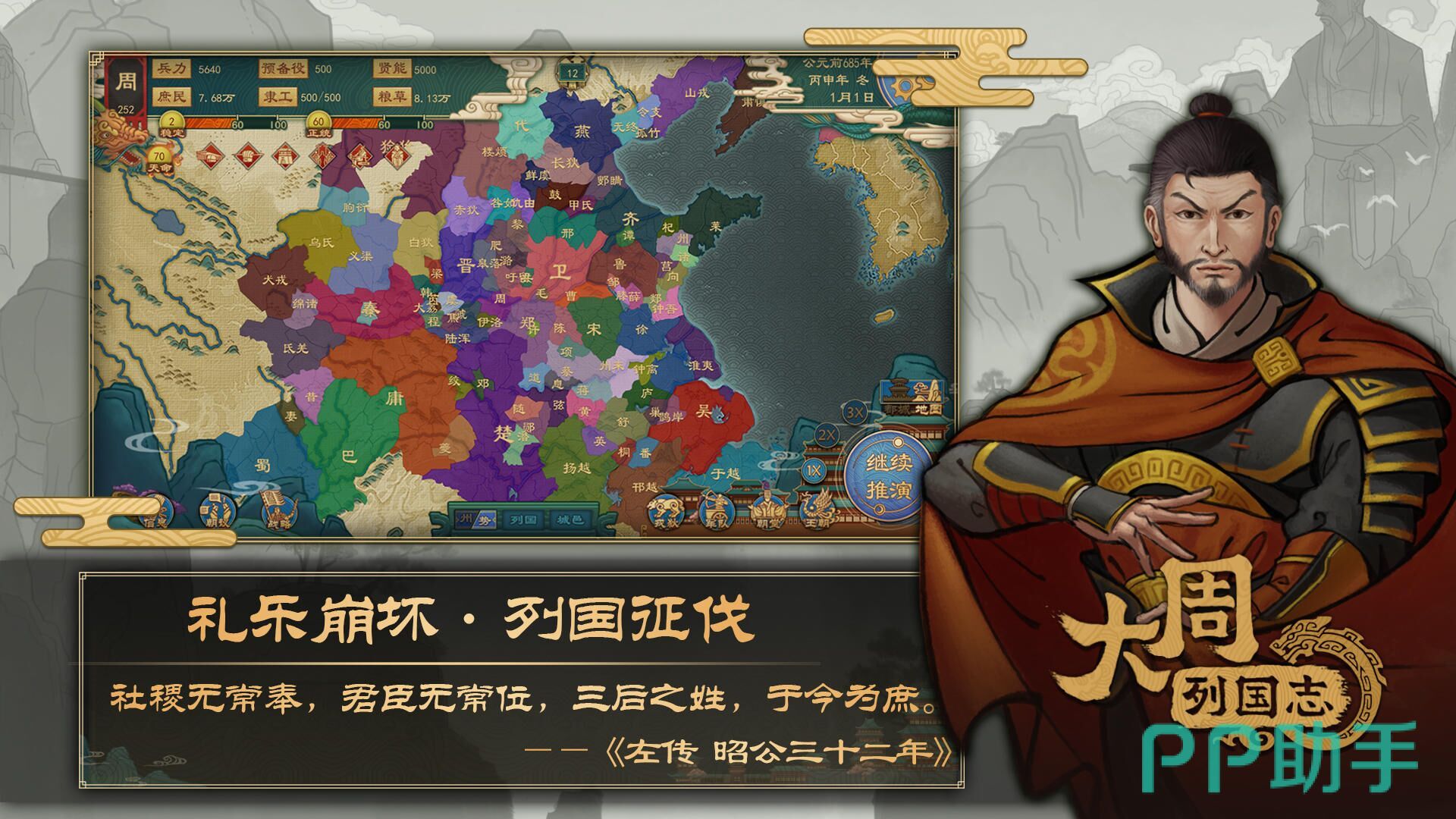 《大周列国志》游戏以春秋战国时期为背景,增加了游戏的历史感。游戏地图资源广大,还原了春秋战国各个国家的领土位置。玩家作为一名封臣,拥有很大的野心,想要吞并各方领土,壮大自己的实力。游戏融入了古代治国理念,有墨家、法家、儒家、道家、纵横五种代表思想。玩家需要用尽计谋,完成统一天下的野心。