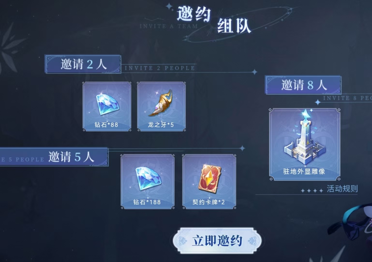 此外,游戏还提供了其他形式的奖励和活动。例如邀请两人就能获得10万面包、10万金币以及500个钻石。公测追加福利有钻石888,契约卡牌10(可进行十连抽),公测专属徽章“永夜守护者”。永夜降临复苏预约奖励中包含的所有契约卡牌有系别契约*2和契约卡牌*10,总体来说永夜降临复苏的奖励还是十分丰富的。