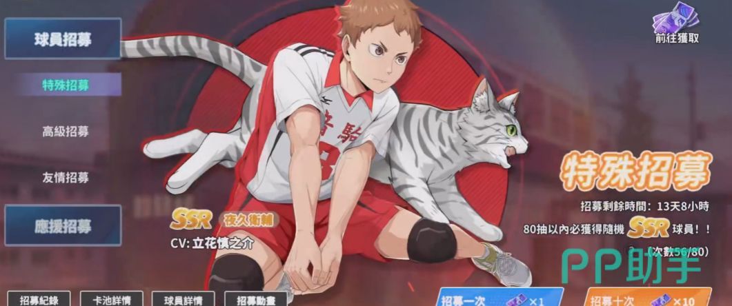 以上就是今天给大家分享的排球少年手游夜久卫辅介绍,所有高校中自由人职业其实承担的责任是最大的,较强的接球和传球能力也是其他SSR卡比不上的,所以想培养音驹高校阵容开局不要错过夜久的首抽。