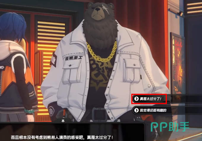 随后就会出现大熊“本”的剧情,传送到光映广场的步行街,遇到本之后会有多个对话选项,第一个随便选,第二个也是随便选,第三个选项则比较关键了,要选择“太过分了”,这样对话完之后会提升超多大熊的好感度。