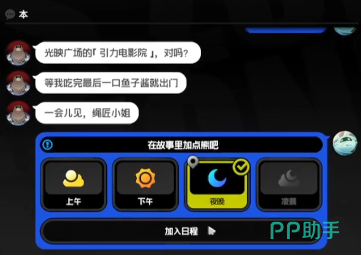 但关键的第三个选项,“最好还是别那么放心”和“光映广场集合!”这里记得要选在指定地点集合,这样就算是邀约成功了,其他前面的对话选项并不是那么的关键。然后将晚上看电影加入日程。
