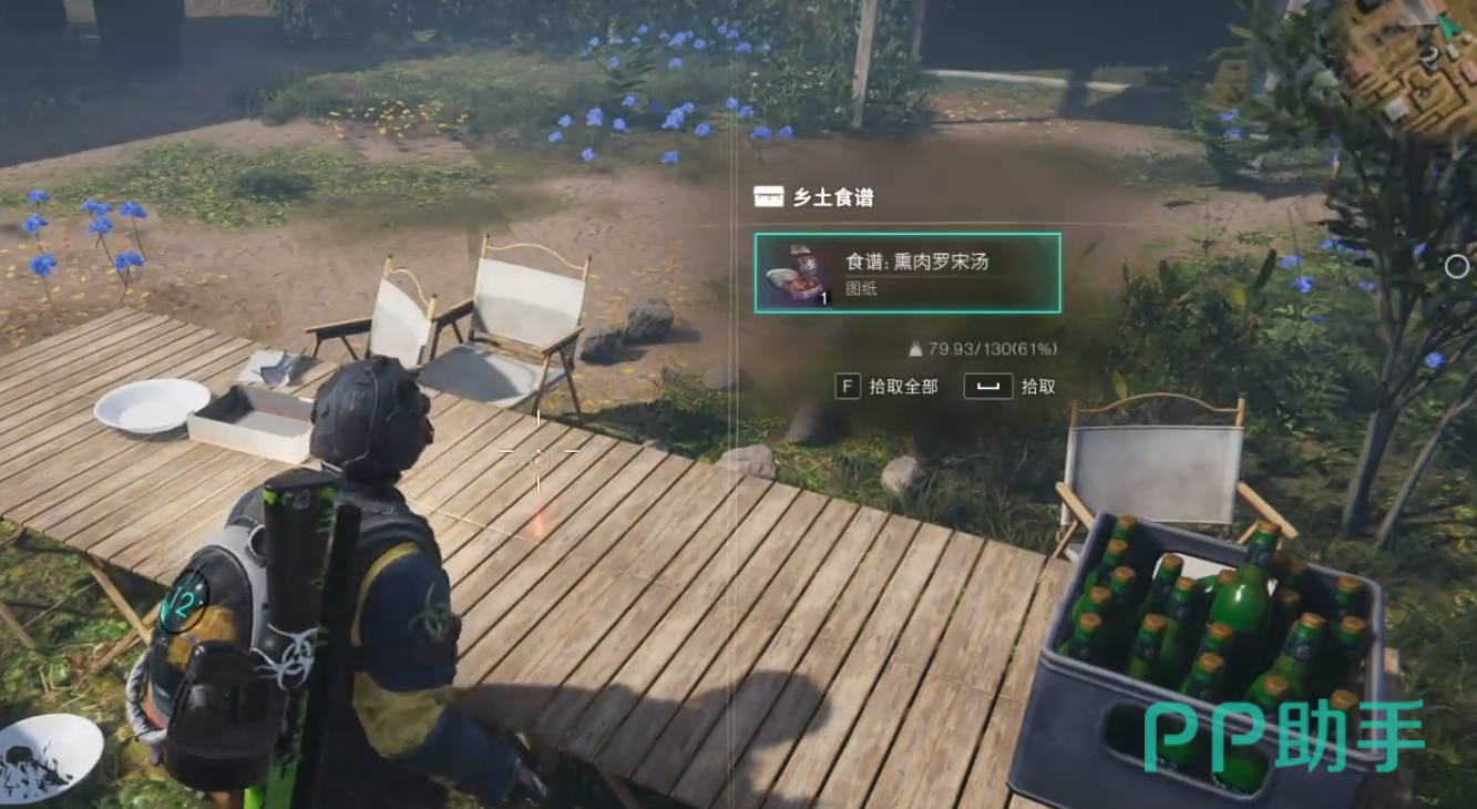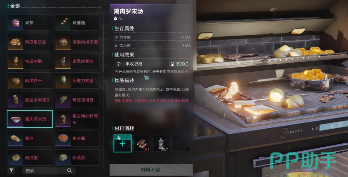 先说说熏肉罗宋汤有什么用,生存属性方面可以提100点饱食度50点饮水度,可以说是有吃有喝了。这还不是关键,重点是它自带的“丰收祝福”效果,可以提升在开武器箱、装备箱时获得的电池数量,直接翻倍。