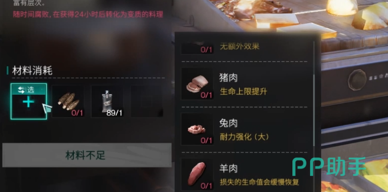 提升资源获取类型的食物,在这种生存射击类网游中的重要性,相信老玩家都是明白的。制作材料只需要需要1个羊肚菌和纯水和1个自选肉类食材,这样就可以在原有属性效果上多一层提升。