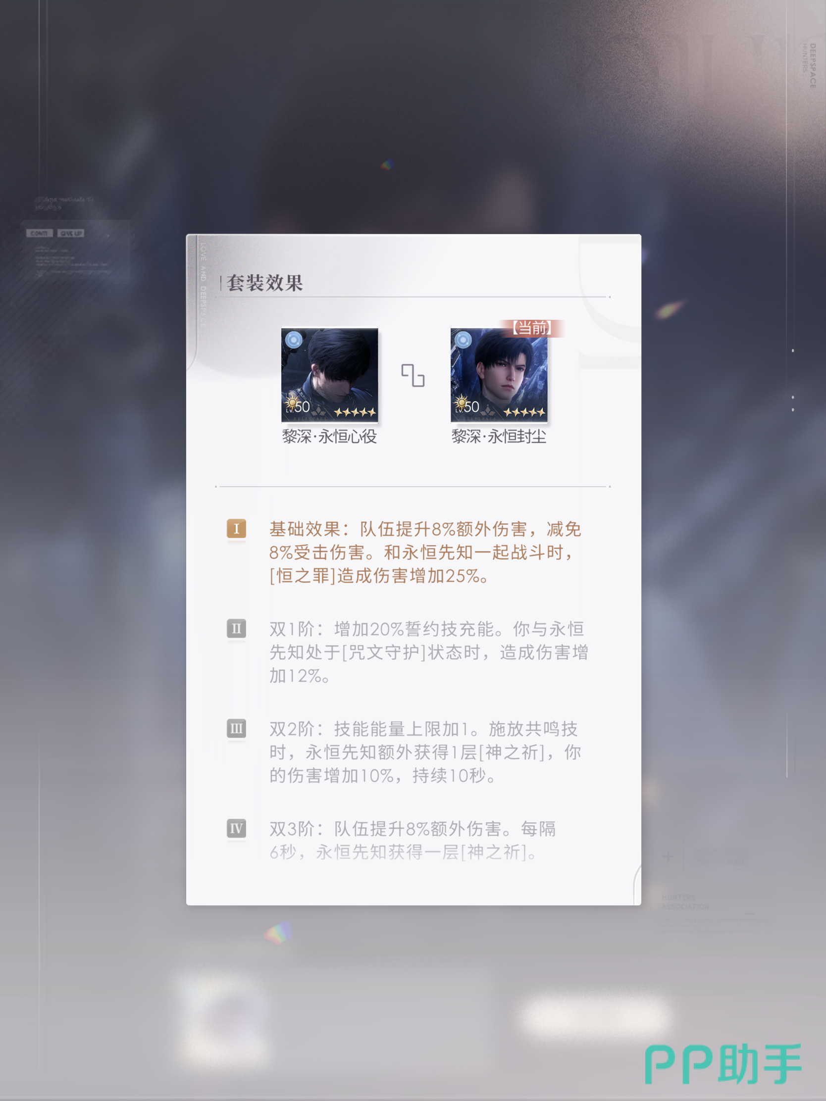 永恒心役与永恒封尘两张日卡同时突破阶段,会触发不同的套装效果:双一阶增加20%的大招充能,处于咒文守护状态的时候,额外增伤12%。双二阶技能能量上限加一,释放共鸣黎深获得一层神之祈,并且玩家伤害持续10秒内增加10%。双三阶,玩家与黎深提升8%,额外伤害每6秒叠一层神之祈。