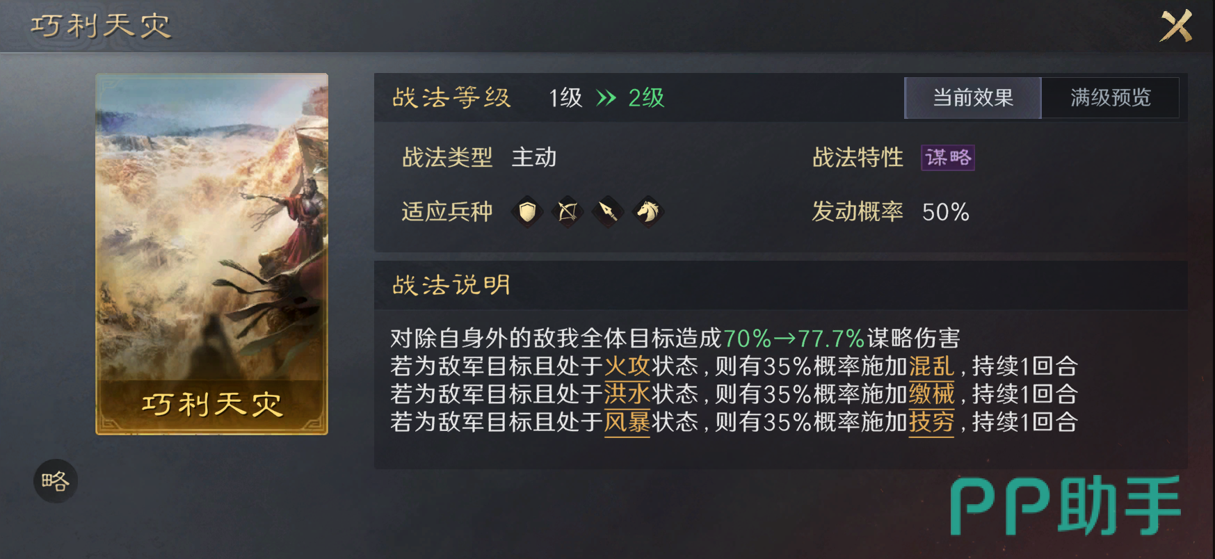 天灾配置的核心在于【巧利天灾】这一橙色品质战法。该战法作为主动谋略型战法,其发动概率和效果在S2赛季中虽可能有所调整,但基础机制并未发生根本性变化。因此,只要玩家能够合理搭配队伍和战法,天灾配置依然能够展现出强大的战斗力。