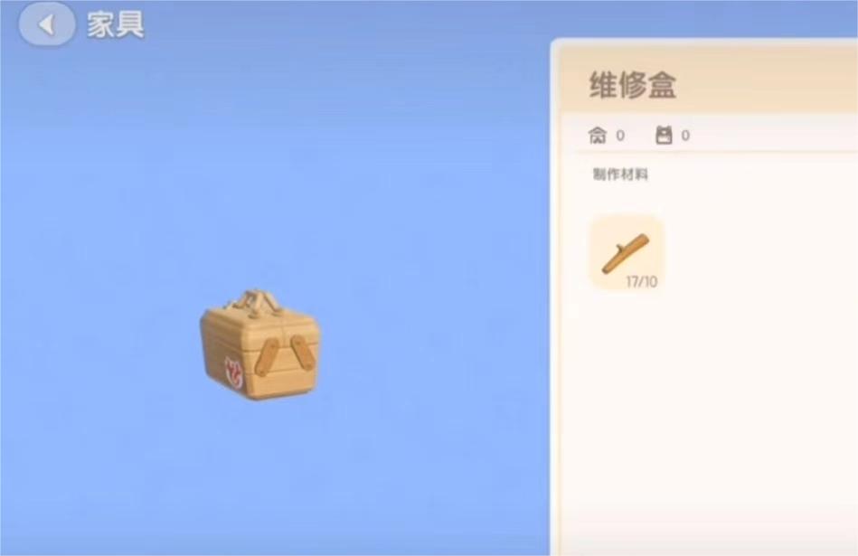 制作台:通过制作台可以制作维修盒。进入游戏后打开制作台界面,树枝可制作成维修盒自用。找到维修盒标志并点击开始制作按钮,完成制作后可在背包中查看。但这只是一种获取维修盒的方式。