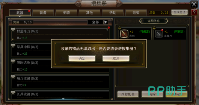 首先是搜集册基本介绍,这个搜集册能收录特定的武器、装备、坐骑等物品,从而帮助玩家的角色获取永久数值加成,不过需要注意的是放入搜集册中的物品,只要点击确定才能真正收录到收集册中,而且收录至搜集册的物品将会彻底消失,无法取出。