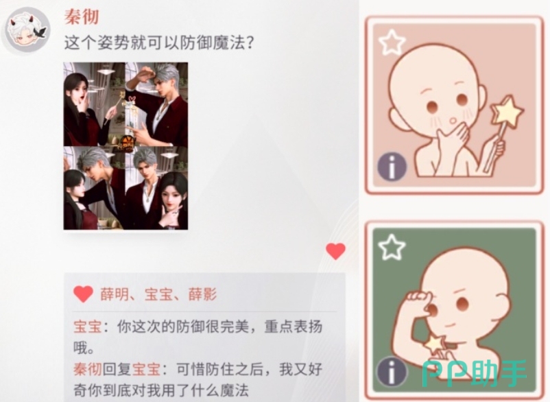 在这个场景中,玩家需要使用特定的魔法棒动作,而秦彻则配合执行他的魔法棒动作。拍完后,保存四宫格照片即可触发朋友圈。这种互动方式不仅具有视觉吸引力,还能让玩家感受到与秦彻之间的神秘联系。