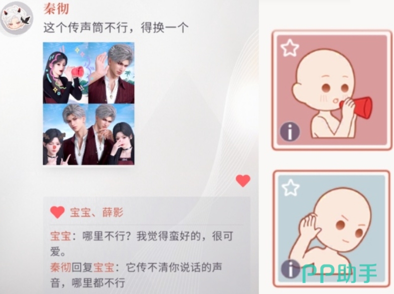 执行特定的喇叭动作,同时秦彻配合侧耳听的动作,拍完后保存四宫格照片,也可以触发朋友圈。这种互动往往会引发一些幽默和轻松的朋友圈内容,让玩家感受到秦彻多样化的个性。