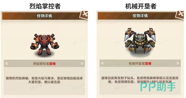 首先boss分成三类,分别是S级、A级和B级,首先给大家介绍S级boss:烈焰掌控者和机械开垦者,烈焰掌控者非常强悍,靠近城墙就会产生大量的伤害,很难被击退,免疫火焰与寒冰,推荐的搭配为:物理枪、干冰弹、无人机、装甲车和龙卷风;机械开垦者可以远距离发射子钻头,免疫燃烧、麻痹及击退效果等,还免疫物理伤害,所以推荐搭配:元素枪、干冰弹、冰爆、高能射线和龙卷风。