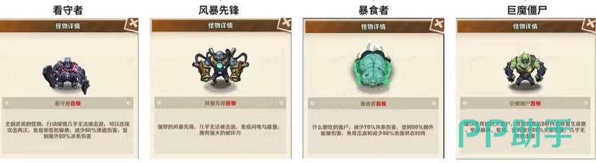 B级首领如看守者、风暴先锋,暴食者等,这些相对S级和A级更没那么难打,玩家在遇到这些boss时可以根据他们的属性来选择,根据免疫的属性如免疫燃烧和可受到的额外伤害来针对他们。
