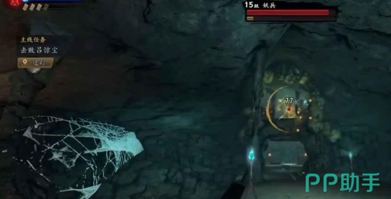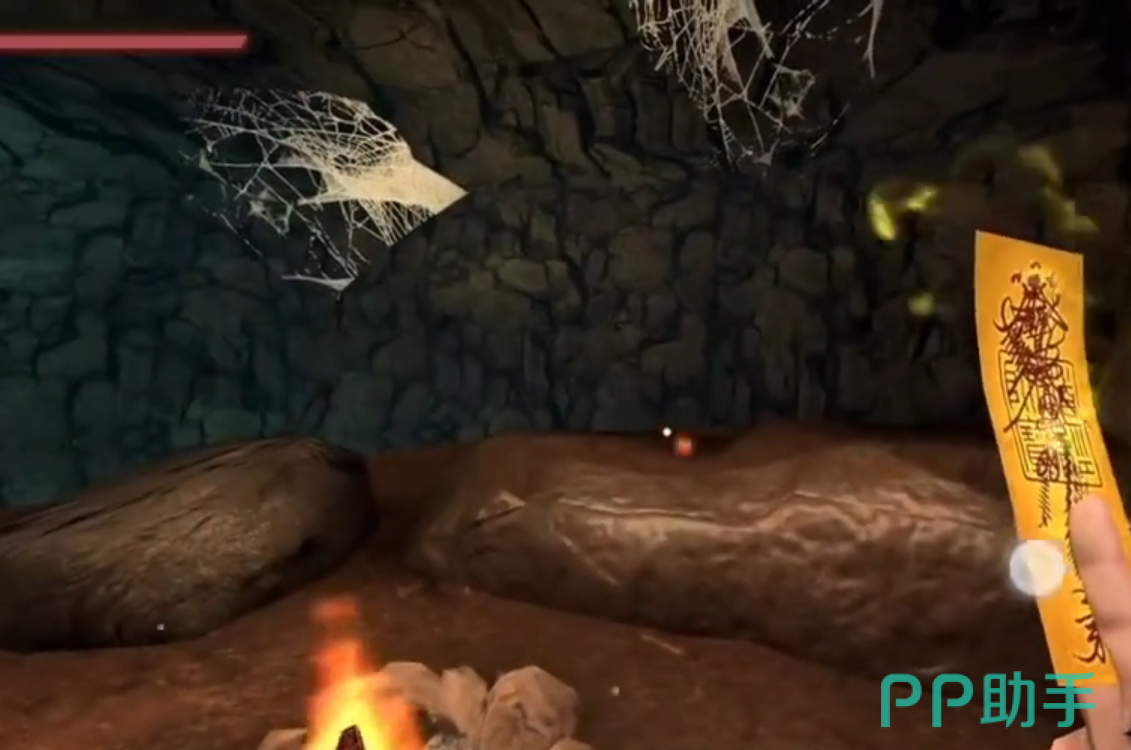 在成功清理掉挡道的小怪后,你会发现前方有一条小道。大家只要沿着这条道路一直前进即可。直直往前走就能够看到前面有火堆,上面还有蜘蛛网,上好的石料就在这里了。