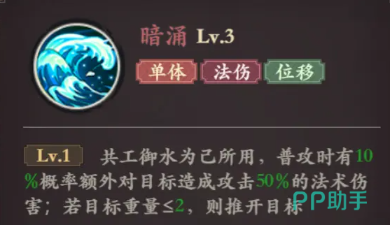 暗涌·被动:共工御水为己所用,普攻时有10%概率额外对目标造成攻击50%的法术伤害。若目标重量小于或者等于2的时候,会推开目标。这是一个锦上添花的被动技能,虽然触发概率不高,但一旦触发就能造成额外的法术伤害。更重要的是,当目标重量较小时,还能产生推开效果,增加战场上的不确定性。